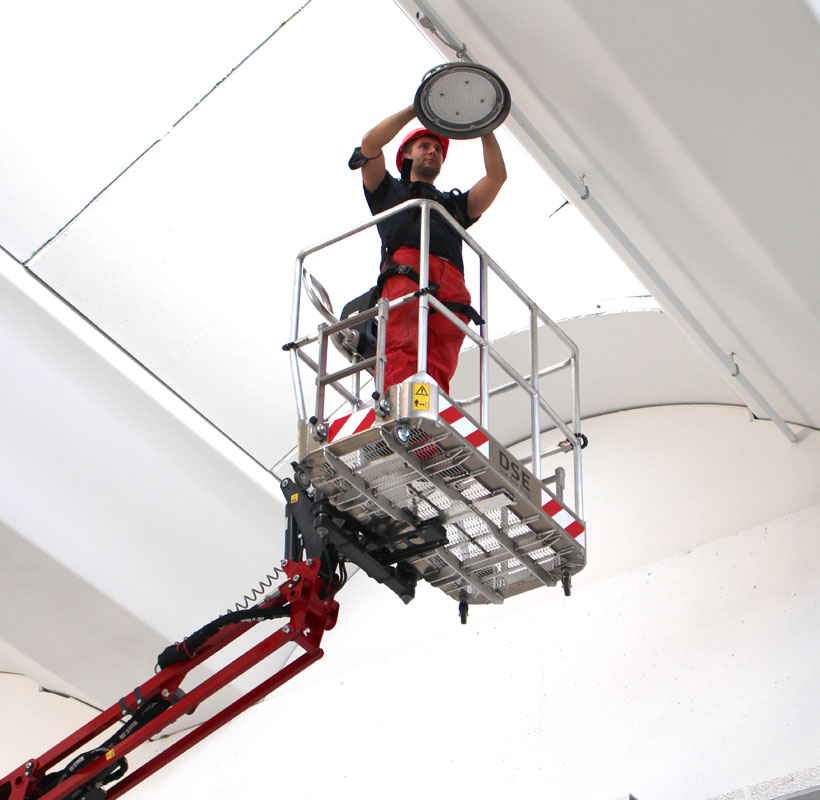- Safety at the top of its category during every stage of work thanks to a series of cutting-edge devices: self-stabilisation system, remote control with visual display, optional non-marking tracks (to avoid damaging surfaces of buildings), front and rear LED work lights and the innovative anti-entrapment device of the new DSE (dual side entry) basket.