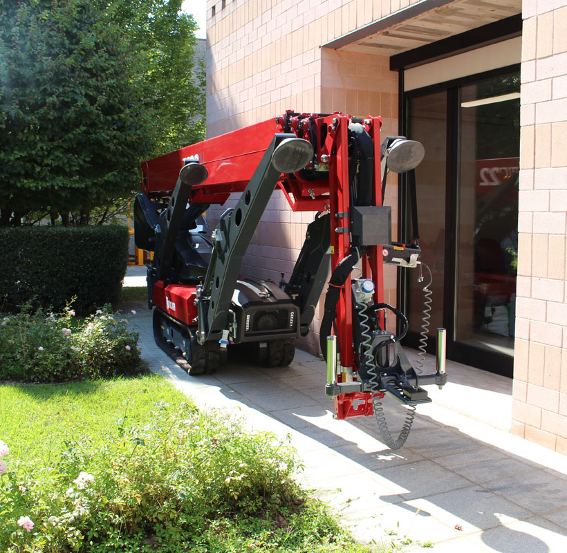 - Automatic control of telescopic boom extension during lifting/lowering: the distance from the wall can be automatically maintained to follow a vertical line during both lifting and lowering. Thanks to this “scissor” effect, the operator can get on with his work, remaining automatically flush to the wall, without having to continuously adjust the extension of the telescopic boom manually. It is therefore possible to work quickly and easily.