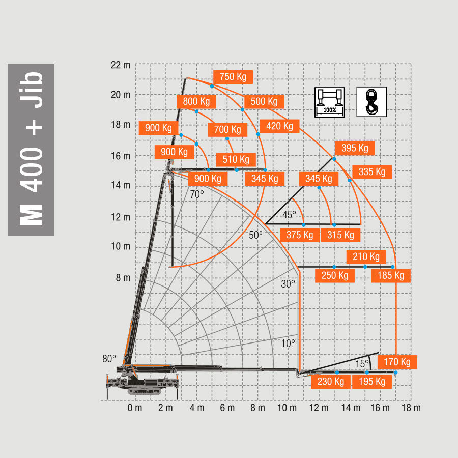 Peso degli elementi | Gru standard: 4300 Kg Jib : 230 Kg Motore elettrico: 40 kg Verricello: 65 kg Zavorra mobile (Pick & Carry): 300 kg |