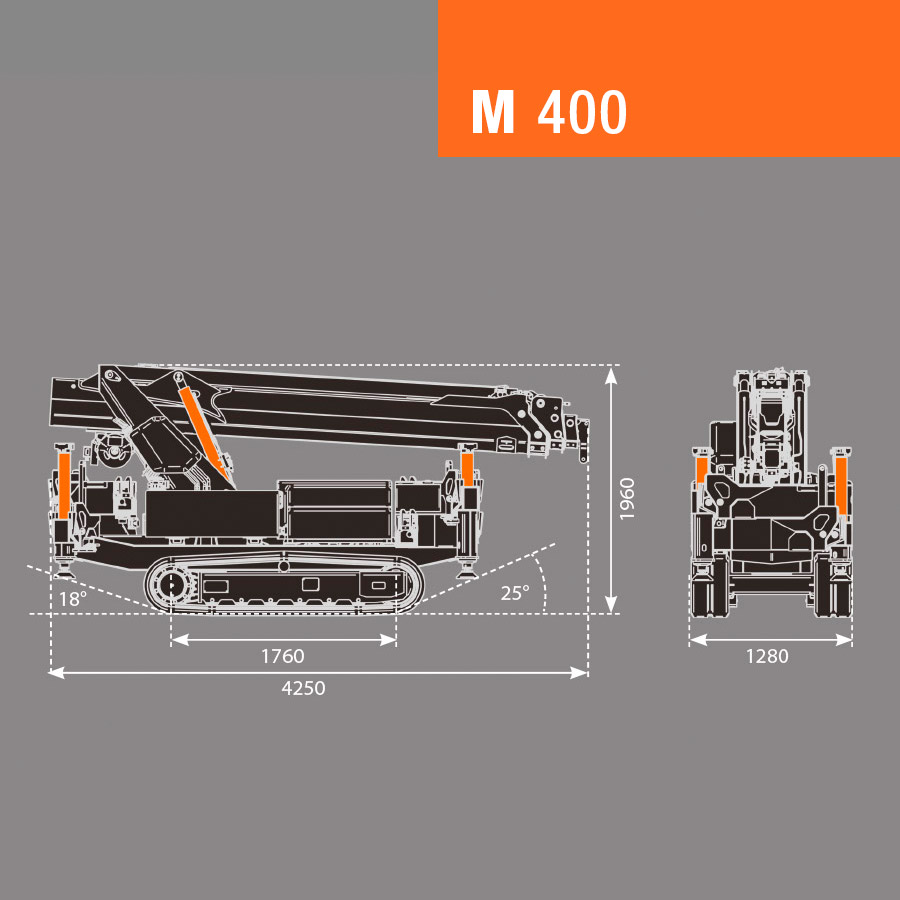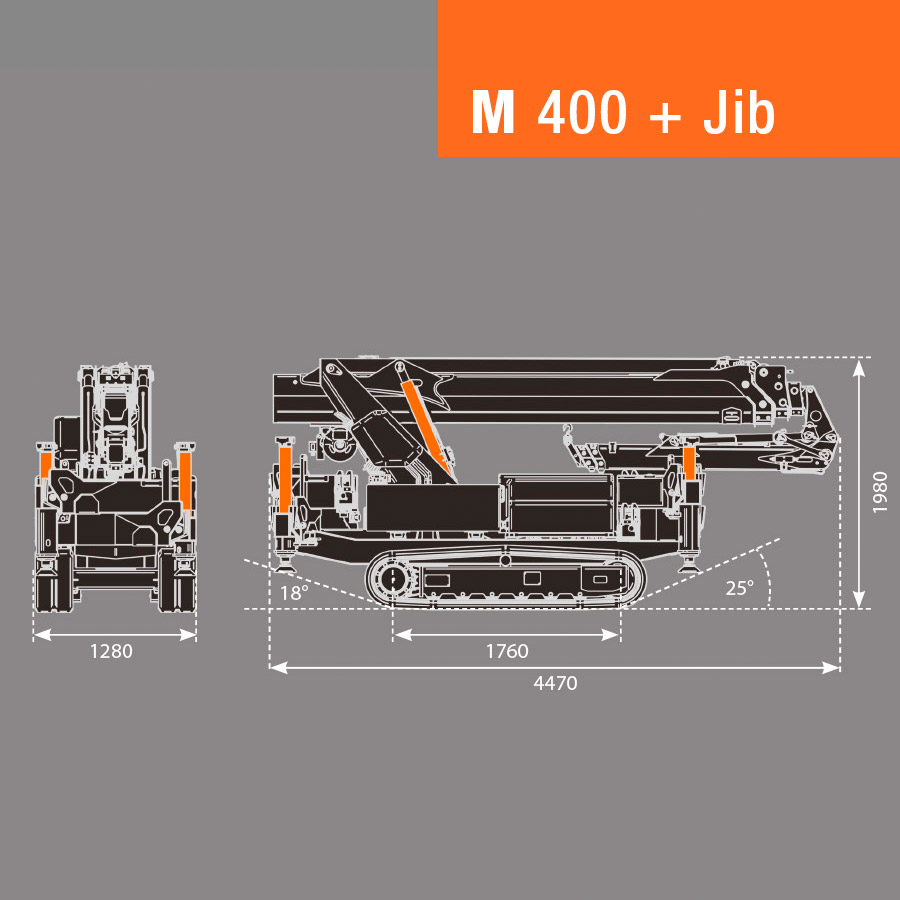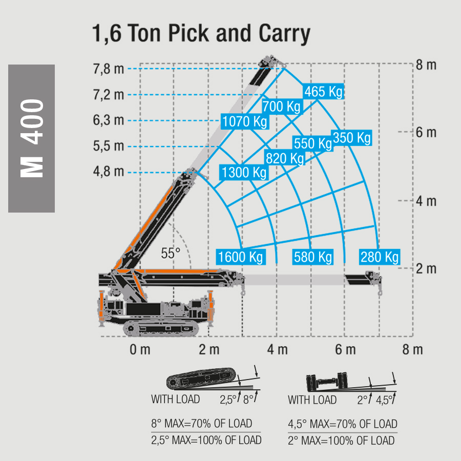 M 400 non è solo un’eccezionale gru compatta cingolata, ma anche un’instancabile gru Pick & Carry capace di muoversi con precisione millimetrica in spazi strettissimi e sollevando fino a 1,6 tonnellate.