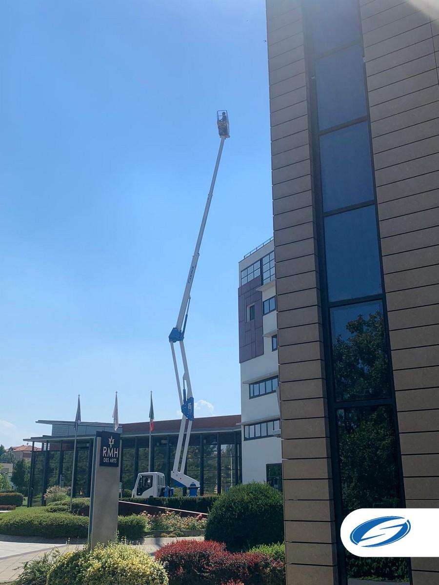 È in grado di raggiungere un’altezza massima di 28,50 m e una portata laterale massima di lavoro di 16 m, con una capacità di carico di 225 kg (2 operatori + materiale).